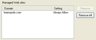 10. Make sure you have entered in teamopolis.com correctly into the edit box, and click the Allow button. The site you have just entered should be now shown in the Managed Web Sites listbox.